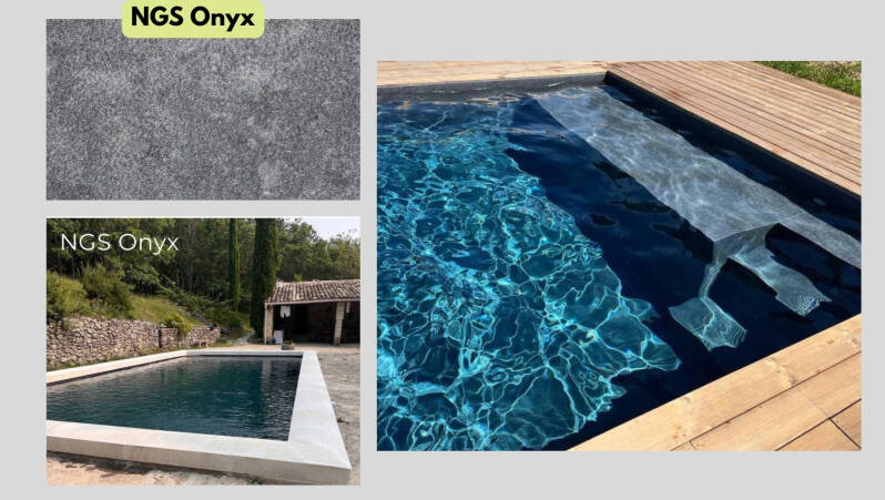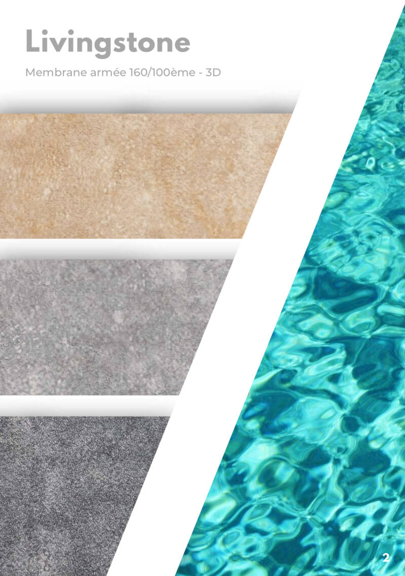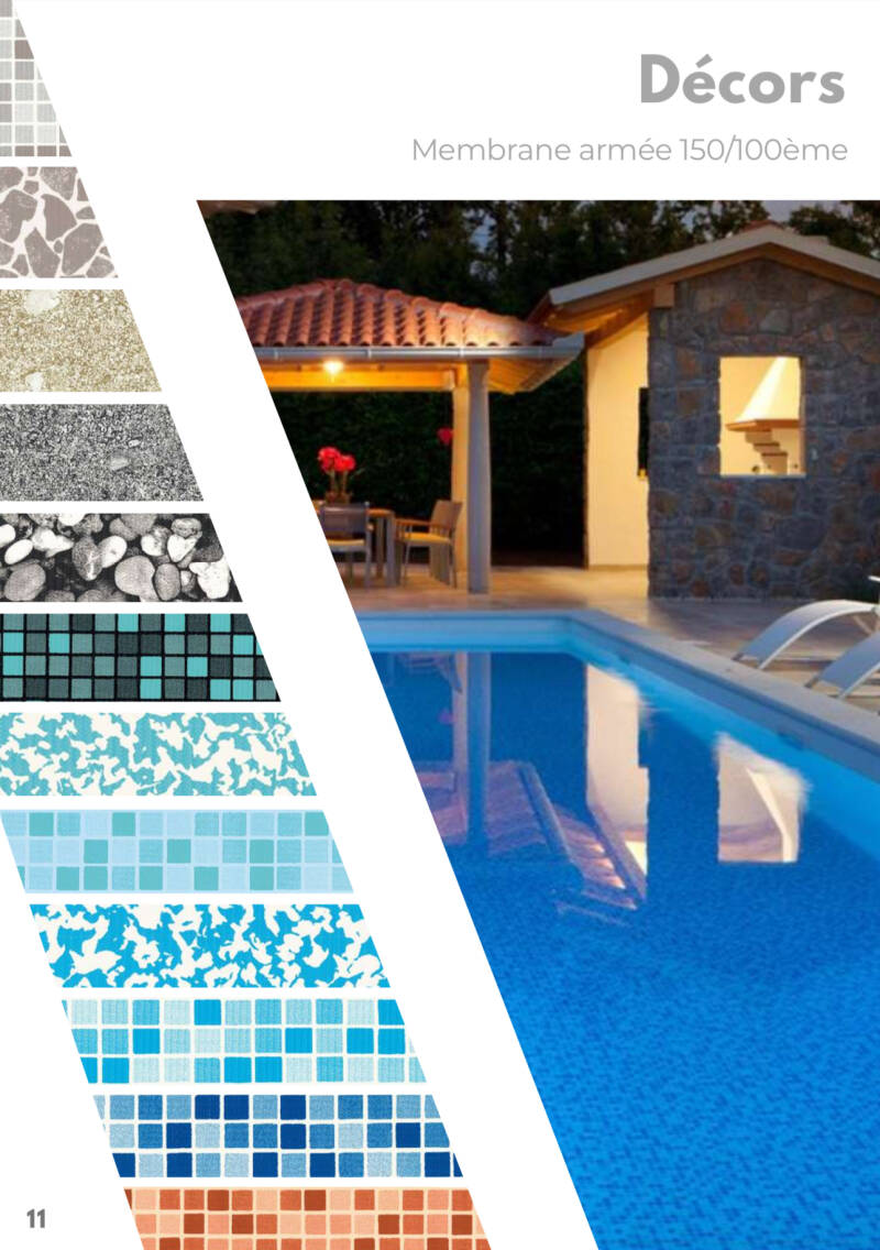 ➡️ La membrane PVC armée assure une belle finition de la piscine. Elle existe en de nombreux coloris unis (blanc, gris, bleu clair ou foncé, sable), imprimés (imitation mosaïque, marbre ou pierre) ou impression 3D en relief.