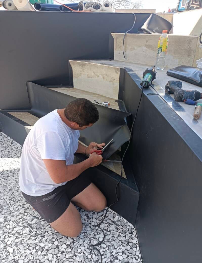 6️⃣ Façonnage et pose de la membrane sur l’escalier.